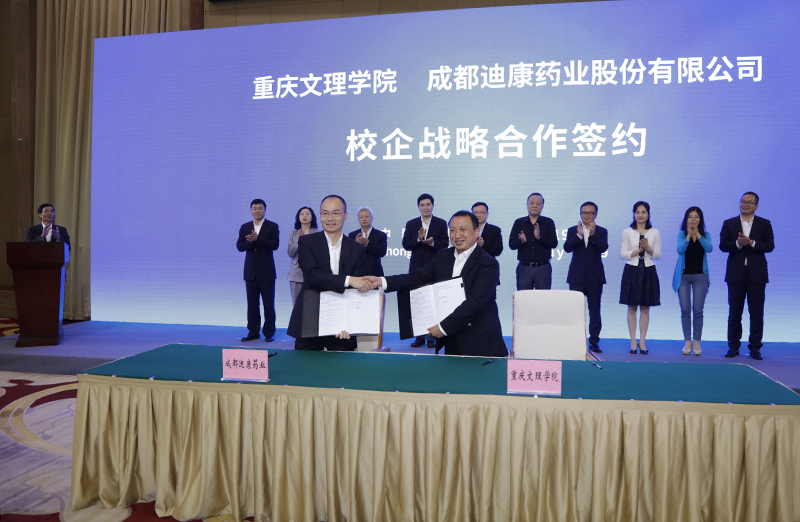 黄伟九和杜曙光分别代表重庆文理学院和成都迪康药业股份有限公司签订校企合作协议。